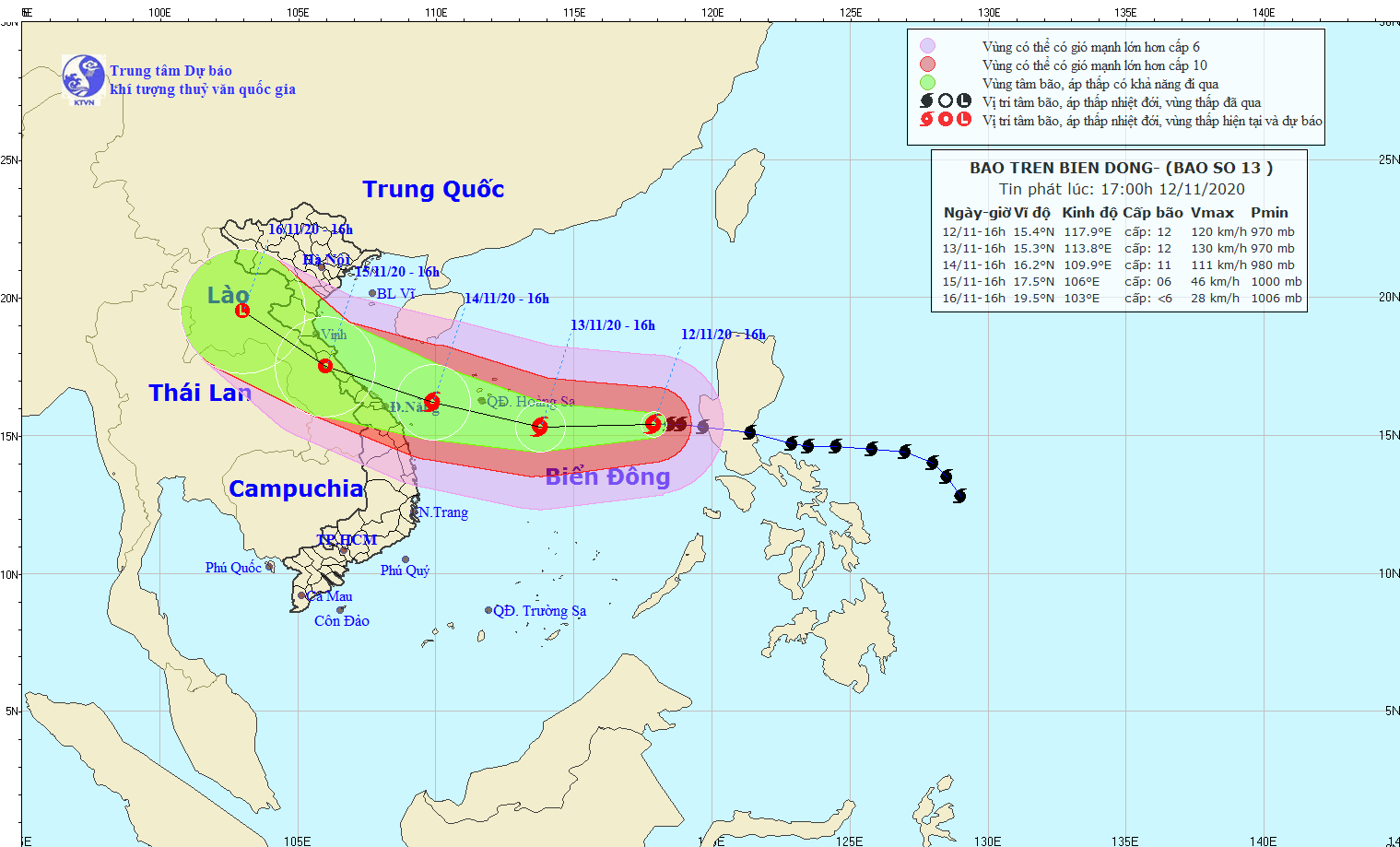 Dự báo trong 24h tới, bão di chuyển theo hướng Tây, mỗi giờ đi được 15-20km. Đến 16 giờ ngày 13/11, vị trí tâm bão ở khoảng 15,3 độ Vĩ Bắc; 113,8 độ Kinh Đông, cách quần đảo Hoàng Sa khoảng 230km về phía Đông Nam. Sức gió mạnh nhất vùng gần tâm bão mạnh cấp 12 (115-135km/giờ), giật cấp 15.