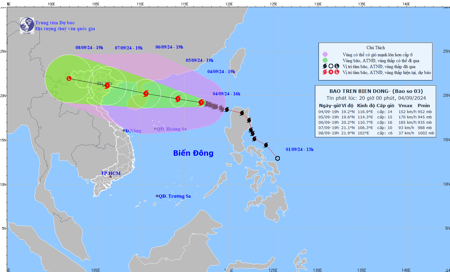 Hồi 19h ngày 5/9/2024: Bão số 3 di chuyển hướng Tây Tây Bắc, tốc độ từ 10-15km/h; Vị trí 19,6N-114,3E; cách đảo Hải Nam (Trung Quốc) khoảng 360km về phía Đông; Cường độ gió cấp 15, giật cấp 17; Vùng nguy hiểm tại phía Bắc vĩ tuyến 16,0N; kinh tuyến 111,5E-119,5E; Cấp độ rủi ro thiên tai (Khu vực chịu ảnh hưởng): Cấp 4, phía Bắc của khu vực Bắc Biển Đông.