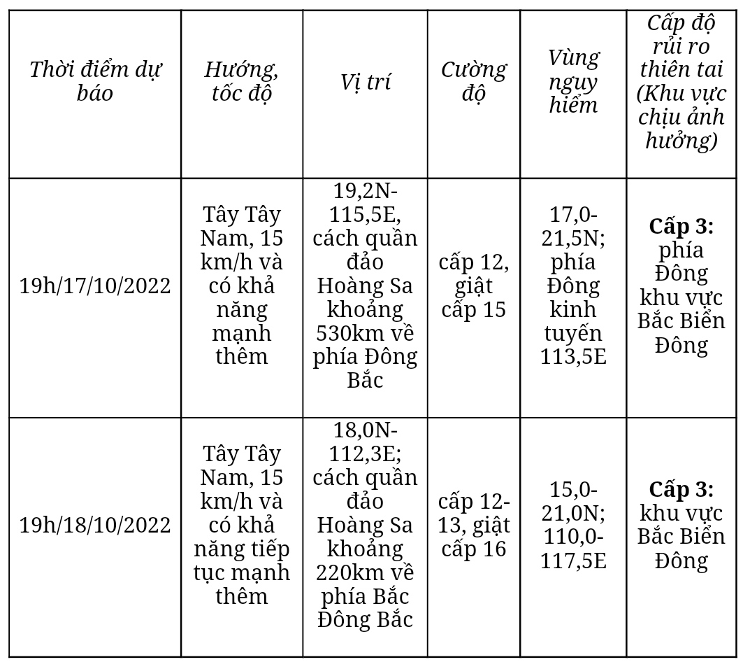 Theo Trung tâm Dự báo khí tượng thủy văn Quốc gia vào hồi 19 giờ ngày 16/10, vị trí tâm bão ở vào khoảng 19,8 độ Vĩ Bắc; 118,9 độ Kinh Đông, cách quần đảo Hoàng Sa khoảng 880km về phía Đông Đông Bắc. Sức gió mạnh nhất vùng gần tâm bão mạnh cấp 11 (103-117km/giờ), giật cấp 13, di chuyển theo hướng Tây Tây Bắc với tốc độ khoảng 20km/h.