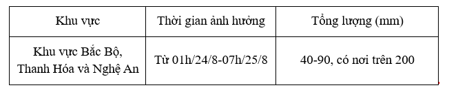 Theo Trung tâm Dự báo Khí tượng Thủy văn Quốc gia, từ rạng sáng ngày 24/8 đến sáng ngày 25/8, khu vực Bắc Bộ, Thanh Hóa và Nghệ An có mưa vừa, mưa to và dông, cục bộ có nơi mưa rất to với lượng mưa phổ biến 40-90mm, có nơi trên 200mm.