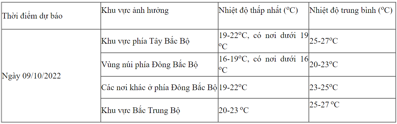 Từ đêm 9/10, ở Bắc Bộ và Bắc Trung Bộ trời lạnh, vùng núi trời rét. Trong đợt không khí lạnh này nhiệt độ thấp nhất về đêm và sáng ở vùng núi Bắc Bộ phổ biến từ 16-18 độ; khu vực trung du, vùng đồng bằng Bắc Bộ và Bắc Trung Bộ từ 19-21 độ.