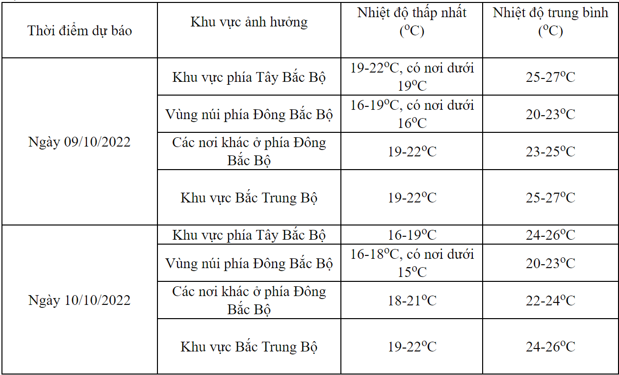 Từ đêm 09/10, ở Bắc Bộ và Bắc Trung Bộ trời trở lạnh, vùng núi Bắc Bộ trời trở rét. Trong đợt không khí lạnh này nhiệt độ thấp nhất về đêm và sáng ở vùng núi Bắc Bộ phổ biến từ 16-18 độ; khu vực trung du, vùng đồng bằng Bắc Bộ và Bắc Trung Bộ từ 18-21 độ.