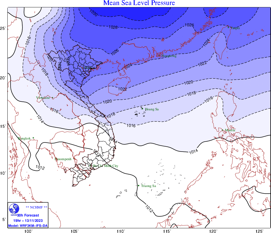 Theo Trung tâm Dự báo Khí tượng Thủy văn Quốc gia cho biết, tối nay (13/11), không khí lạnh đã ảnh hưởng đến một số nơi ở Trung Trung Bộ. Ở trạm đảo Bạch Long Vỹ đã có gió Đông Bắc mạnh cấp 6, có lúc cấp 7, giật cấp 8; trạm đảo Hòn Ngư có gió giật mạnh cấp 8; trạm đảo Cồn Cỏ có gió Đông Bắc mạnh cấp 6, giật cấp 7.