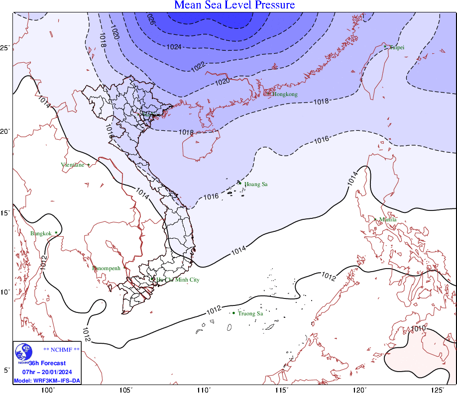 Trên đất liền: Khoảng chiều và đêm 20/01, bộ phận không khí lạnh này sẽ ảnh hưởng đến khu vực phía Đông Bắc Bộ, sau đó ảnh hưởng đến một số nơi ở phía Tây Bắc Bộ và Bắc Trung Bộ. Khoảng ngày 22/01, không khí lạnh được tăng cường mạnh thêm và ảnh hưởng đến các nơi khác ở Bắc Bộ, Bắc Trung Bộ, sau đó ảnh hưởng đến khu vực Trung và Nam Trung Bộ. Từ chiều và đêm ngày 20/01 gió trong đất liền chuyển hướng Đông Bắc mạnh dần lên cấp 2-3; từ ngày 22/01 mạnh lên cấp 3, vùng ven biển cấp 4-5, giật cấp 6-7.