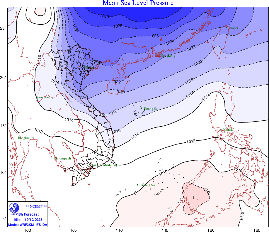 Từ ngày 20/12, vùng biển từ Quảng Trị đến Cà Mau, khu vực Giữa Biển Đông và vùng biển phía Tây của khu vực Nam Biển Đông (bao gồm vùng biển phía Tây quần đảo Trường Sa) có gió Đông Bắc mạnh cấp 6-7, giật cấp 8-9, sóng biển cao 4,0-6,0m, biển động rất mạnh.