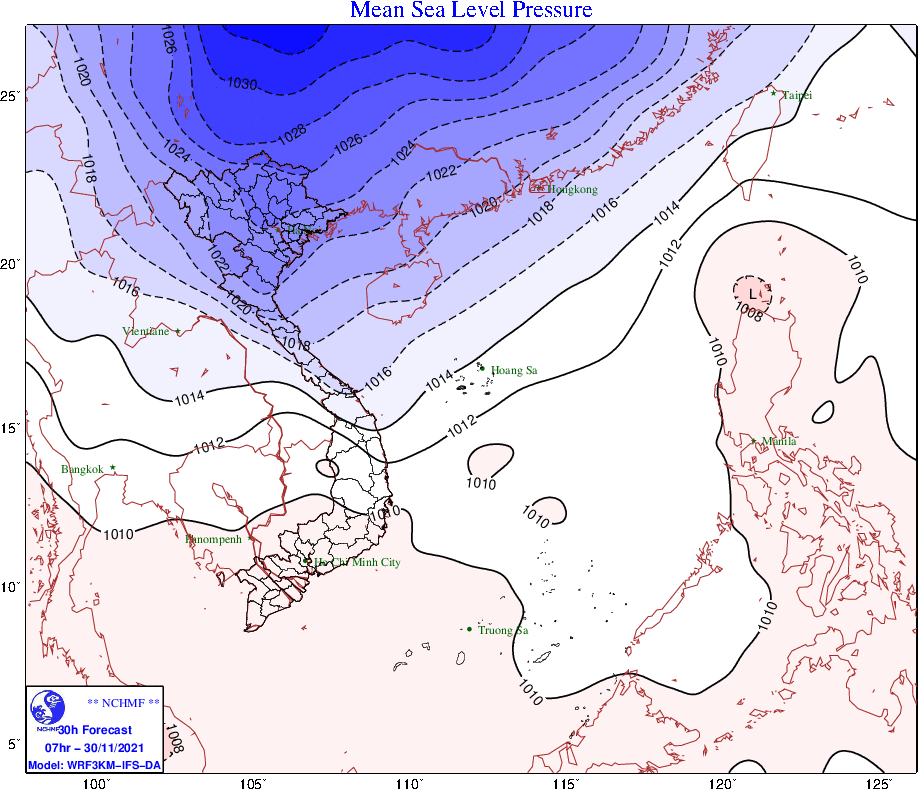 Từ gần sáng mai (30/11), trong đất liền gió Đông Bắc mạnh dần lên cấp 3, vùng ven biển cấp 4-5; ở vịnh Bắc Bộ gió Đông Bắc mạnh dần lên cấp 6, giật cấp 8, biển động, sóng biển cao từ 2,0-3,0m. Từ Quảng Trị đến Quảng Ngãi và khu vực giữa Biển Đông gió đông bắc tiếp tục mạnh cấp 6, có lúc cấp 7, giật cấp 8, biển động mạnh, sóng biển cao từ 2,0-4,0m; khu vực Bắc Biển Đông (bao gồm cả vùng biển quần đảo Hoàng Sa) có gió Đông Bắc mạnh cấp 6-7, giật cấp 8-9, biển động mạnh, sóng biển cao từ 3,0-5,0m.