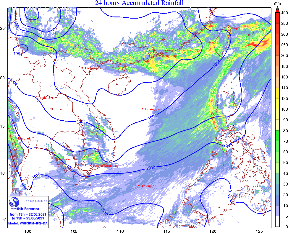 Dự báo: Do ảnh hưởng của rãnh áp thấp phân tích trên kết hợp với hội tụ gió lên đến 5000m có khả năng thiết lập trên khu vực Bắc Bộ nên từ chiều tối và đêm mai (22/6) đến hết đêm 25/6, ở khu vực vùng núi và trung du Bắc Bộ có mưa vừa, mưa to, có nơi mưa rất to với lượng mưa phổ biến 100-200mm/đợt, có nơi trên 250mm/đợt (mưa lớn tập trung từ chiều tối đến đêm); khu vực đồng bằng Bắc Bộ và Thanh Hóa ngày có mưa rào và dông cục bộ; chiều tối và đêm có mưa rào và dông, cục bộ có mưa to. Trong mưa dông có khả năng xảy ra lốc, sét và gió giật mạnh. Nguy cơ xảy ra lũ quét, sạt lở đất và ngập úng cục bộ tại các tỉnh miền núi.