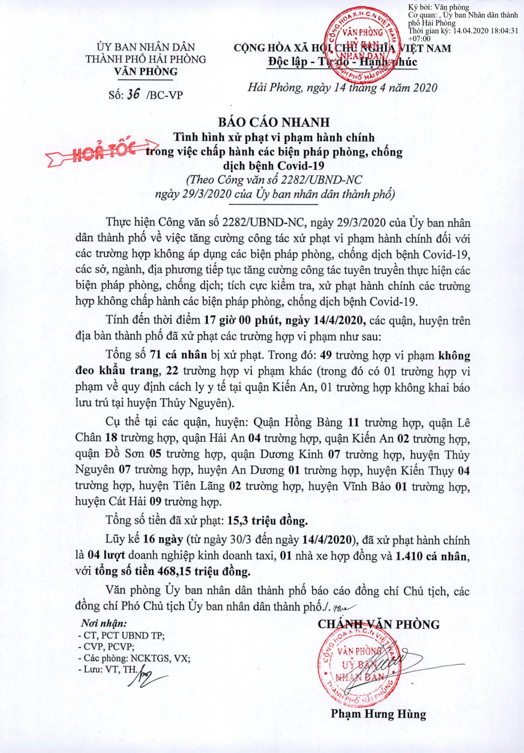 – Tổng số 71 cá nhân bị xử phạt. Trong đó 49 trường hợp vi phạm không đeo khẩu trang, 22 trường hợp vi phạm các quy định khác (trong đó có 01 trường hợp vi phạm về quy định cách ly y tế tại quận Kiến An, 01 trường hợp không khai báo lưu trú tại huyện Thủy Nguyên).
