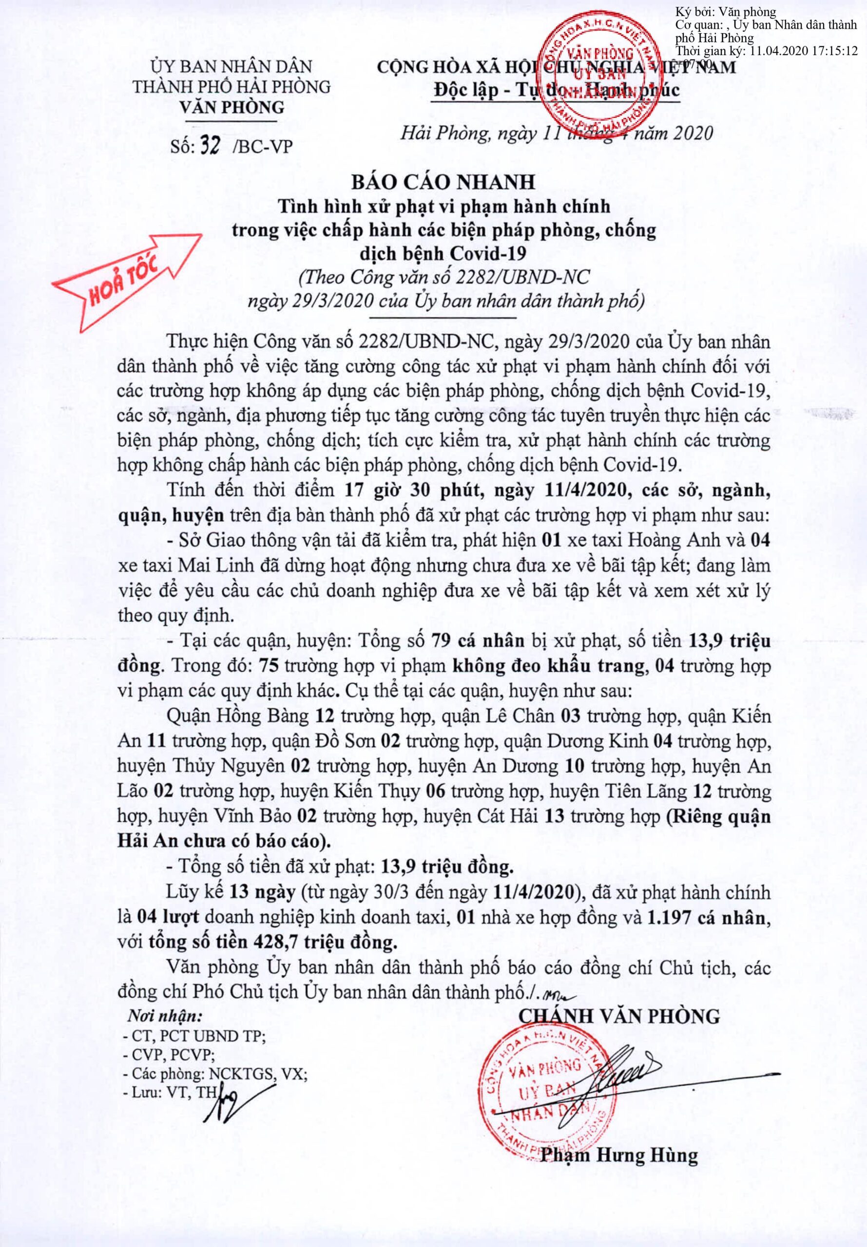 Thực hiện tăng cường công tác xử phạt vi phạm hành chính đối với các trường hợp không áp dụng các biện pháp phòng, chống dịch bệnh Covid-19, tính đến thời điểm 17 giờ 30 phút, ngày 11/4/2020, các Sở, ngành, quận, huyện trên địa bàn thành phố đã xử phạt các trường hợp vi phạm với tổng số tiền là 13,9 triệu đồng.