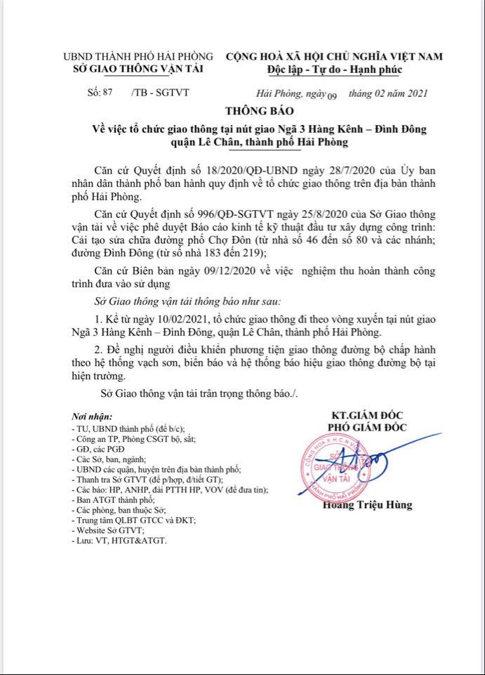 Sở Giao thông vận tải vừa có Thông báo số 87/TB-SGTVT ngày 09/02/2021 về việc tổ chức giao thông tại nút giao Ngã 3 Hàng Kênh-Đình Đông quận Lê Chân, thành phố Hải Phòng.