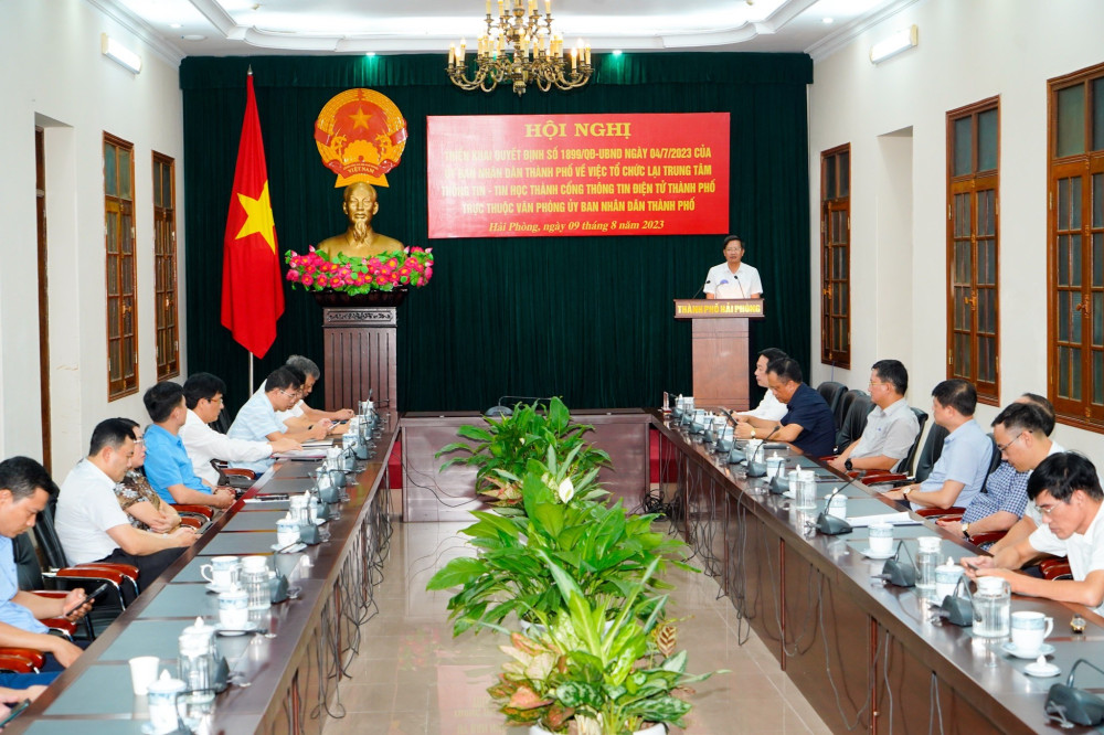 Chiều 9/8, Văn phòng UBND thành phố tổ chức Hội nghị triển khai Quyết định số 1899/QĐ-UBND ngày 4/7/2023 của UBND thành phố về việc tổ chức lại Trung tâm Thông tin-Tin học thành Cổng Thông tin điện tử thành phố trực thuộc Văn phòng UBND thành phố. Phó Chủ tịch Thường trực UBND thành phố Lê Anh Quân dự và chỉ đạo Hội nghị.