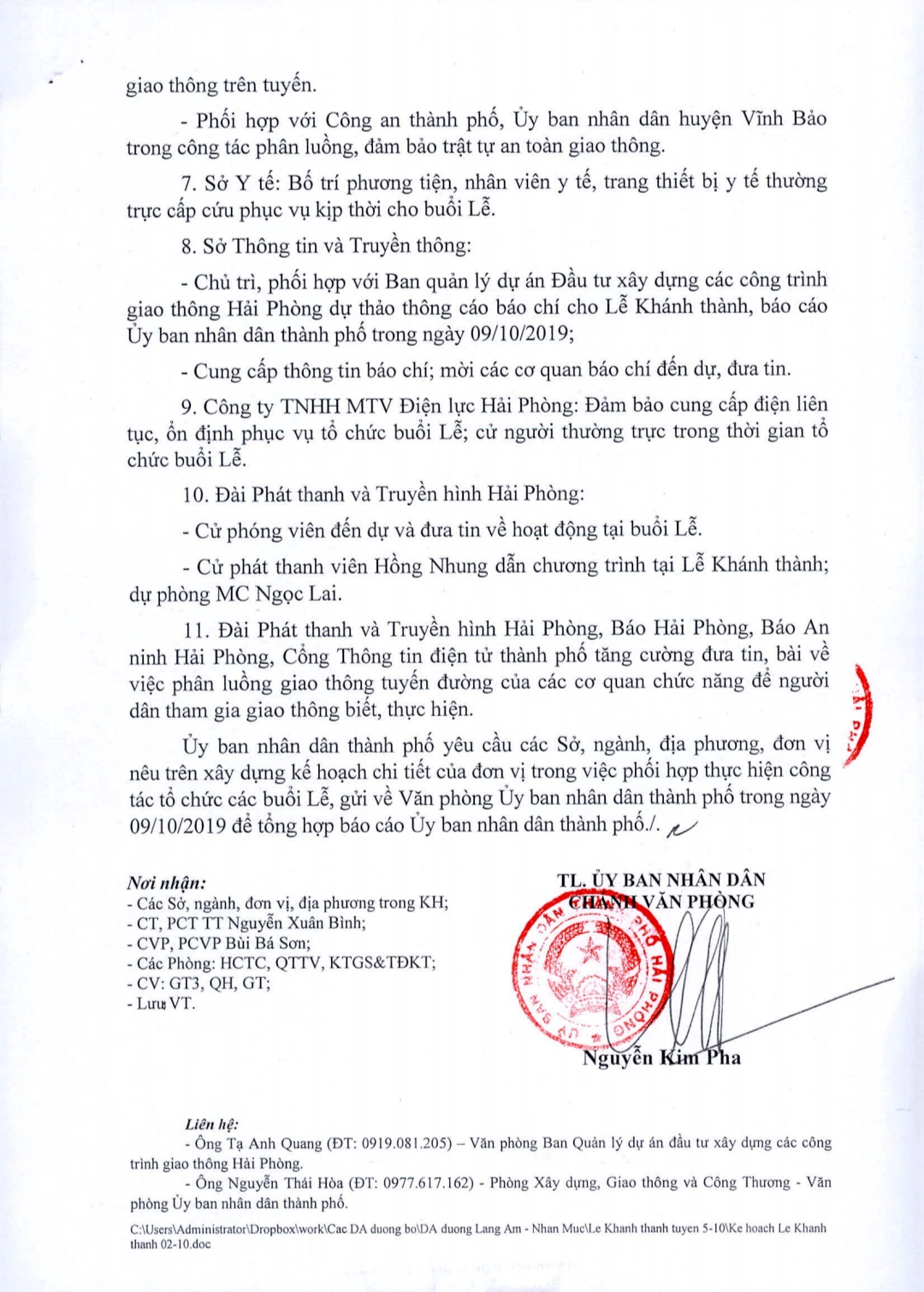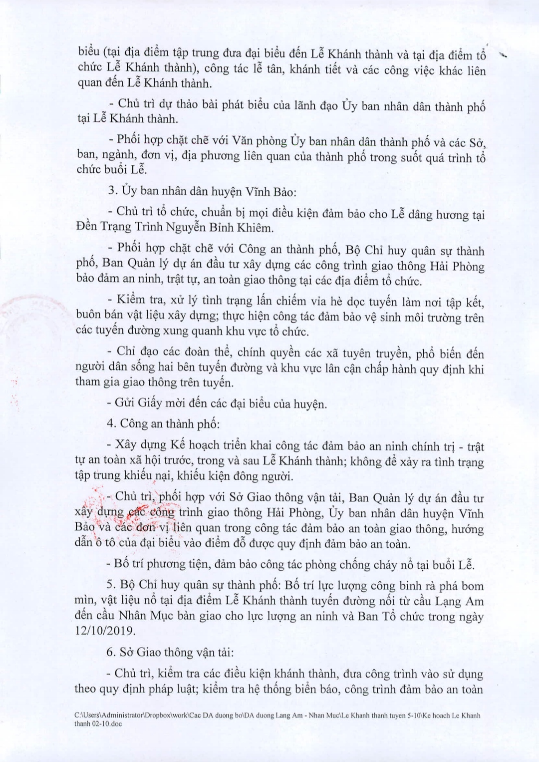 Ủy ban nhân dân thành phố Hải Phòng phân công nhiệm vụ cho các ngành, cấp, đơn vị liên quan phối hợp thực hiện công tác tổ chức Lễ Khánh thành tuyến đường nối từ cầu Lạng Am đến cầu Nhân Mục.