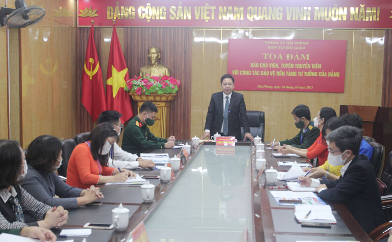 Sáng 26/10, Ban Tuyên giáo Thành ủy tổ chức Tọa đàm “Báo cáo viên, tuyên truyền viên với công tác bảo vệ nền tảng tư tưởng của Đảng”. Đồng chí Đào Văn Hoàn, Phó Trưởng Ban Tuyên giáo Thành ủy chủ trì buổi tọa đàm. Dự tọa đàm có đại diện Thường trực Ban Chỉ đạo 35 các quận, huyện và 8 thí sinh dự thi Vòng Chung khảo Hội thi cấp thành phố năm 2021.