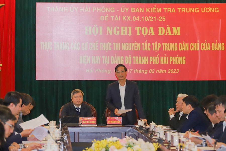 Phát biểu tại Tọa đàm, đồng chí Trần Tiến Hưng, Phó Chủ nhiệm Ủy ban Kiểm tra Trung ương ghi nhận, cảm ơn những ý kiến trách nhiệm từ kinh nghiệm thực tiễn của các địa phương, đơn vị của thành phố Hải Phòng đã nêu ra để cùng trao đổi, thảo luận, tham gia ý kiến, phân tích, làm rõ sâu sắc hơn nội hàm cơ chế thực thi, nhất là làm rõ những hạn chế, vướng mắc, từ đó, đề xuất giải pháp mới, mang tính đột phá. Đồng chí nhấn mạnh, việc tổ chức tọa đàm có giá trị lý luận và thực tiễn quan trọng, giúp ban chủ nhiệm đề tài có thêm cơ sở tổng kết, đánh giá việc thực hiện cơ chế thực thi nguyên tắc tập trung dân chủ thời gian qua, góp phần tổng kết 40 năm đổi mới, sửa đổi, bổ sung Cương lĩnh và phục vụ xây dựng dự thảo Văn kiện Đại hội XIV của Đảng, qua đó, đề xuất các giải pháp hoàn thiện cơ chế thực thi thời gian tới.