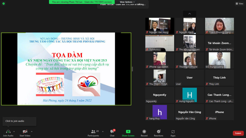 Sáng 24/3, Trung tâm Công tác xã hội thành phố Hải Phòng tổ chức Tọa đàm trực tuyến kỷ niệm ngày Công tác xã hội Việt Nam 25/3 với chuyên đề “Trao đổi, chia sẻ vai trò của người làm công tác xã hội trong trợ giúp đối tượng”.