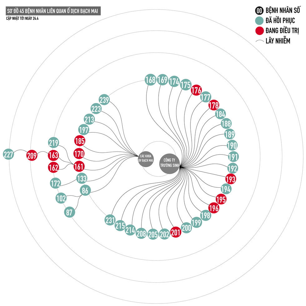 Tới nay, từ ổ dịch Bệnh viện Bạch Mai đã có 58 bệnh nhân liên quan (tính cả bệnh nhân 243 và các bệnh nhân liên quan tại thôn Hạ Lôi, xã Mê Linh, huyện Mê Linh, Hà Nội). Trong số này, 27 bệnh nhân là nhân viên của Công ty TNHH Trường Sinh, cung cấp suất ăn, nước uống cho bệnh viện này. Các trường hợp còn lại là nhân viên y tế, bệnh nhân và người nhà bệnh nhân khám chữa bệnh tại Bệnh viện Bạch Mai.