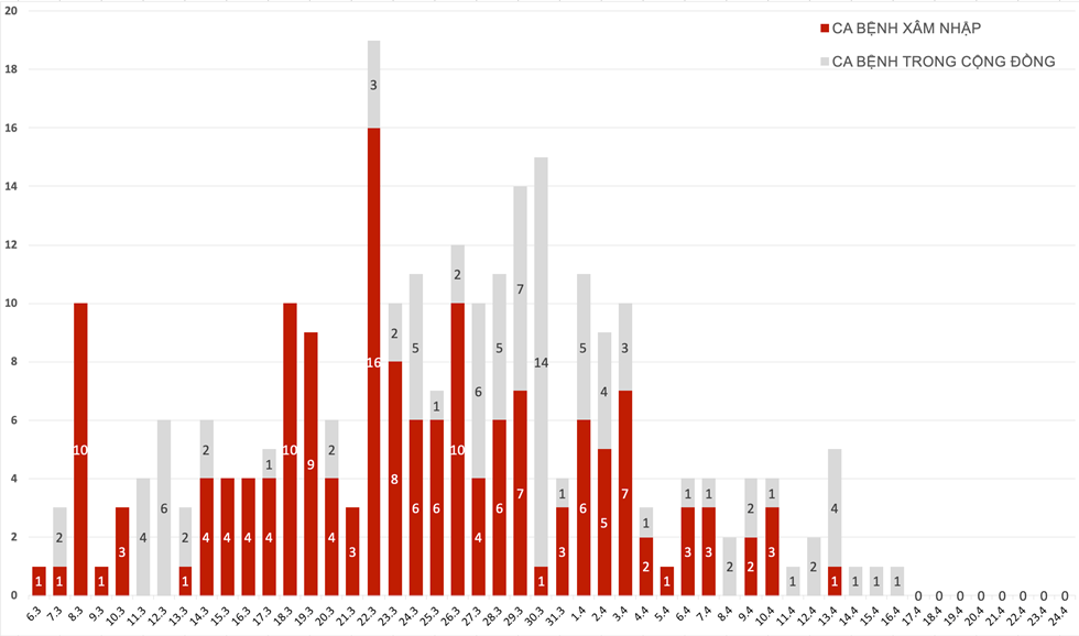 Tuy nhiên, tới nay, ngoài 12 ca bệnh được ghi nhận, chưa có thêm trường hợp nào liên quan tới ổ dịch này. Các mẫu xét nghiệm các đối tượng nguy cơ đều cho kết quả âm tính. Kể từ ngày 14.4, mỗi ngày Việt Nam chỉ ghi nhận thêm 1 bệnh nhân mới và từ 17.4 tới nay không có thêm ca bệnh mới nào.