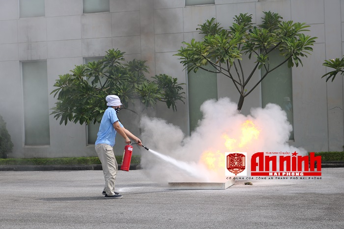 Công nhân viên Công ty thực hành sử dụng phương tiện chữa cháy. Ảnh Minh Phương