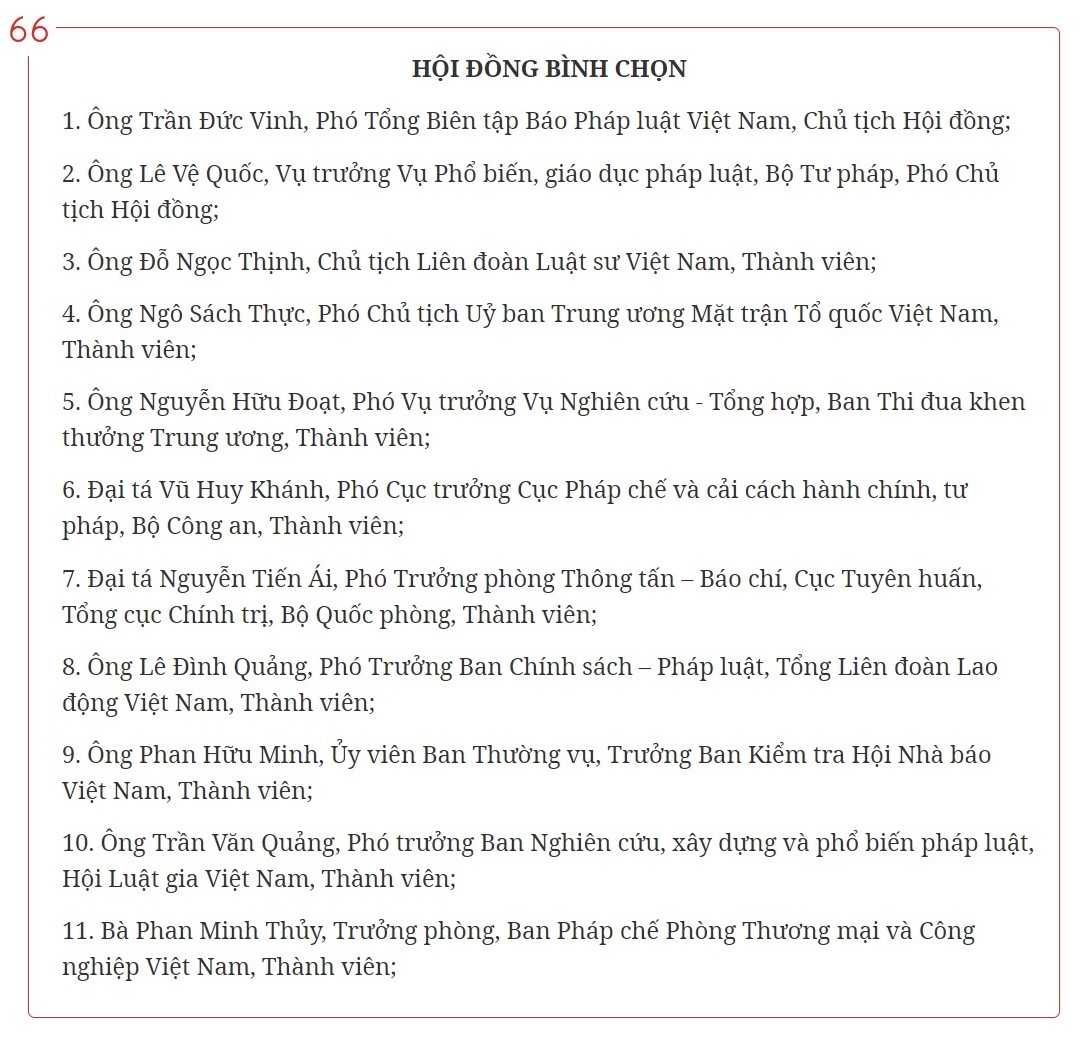 Trưởng ban Tổ chức, TS Đào Văn Hội, Tổng Biên tập Báo Pháp luật Việt Nam cho biết: đối tượng bình chọn là công chức, viên chức, người lao động trong cơ quan Nhà nước, lực lượng vũ trang, doanh nghiệp và nhân dân có thành tích và được cơ quan nơi công tác, cơ quan Nhà nước quản lý ngành, lĩnh vực hoặc các tổ chức chính trị, tổ chức chính trị xã hội, tổ chức xã hội nghề nghiệp xét tặng danh hiệu, giải thưởng từ cấp tỉnh, thành phố trở lên về những nỗ lực, đóng góp trong quá trình thực hiện nhiệm vụ.