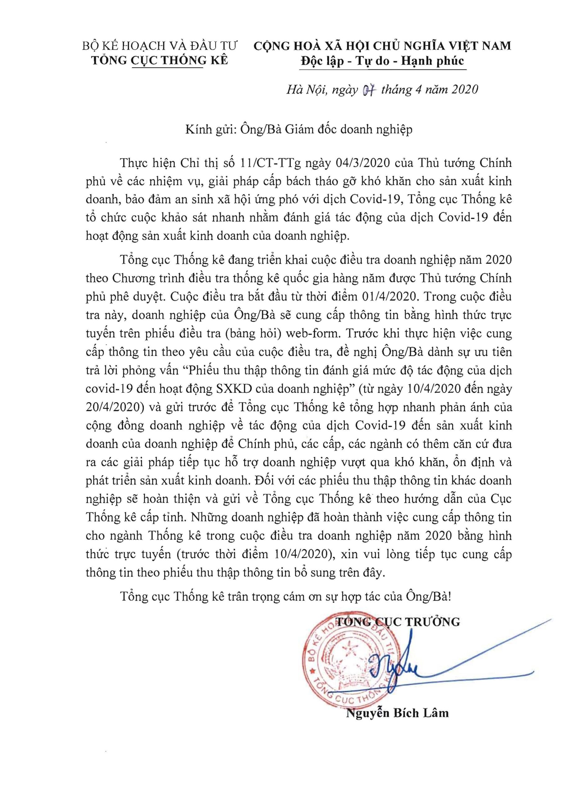 Để Chính phủ, Địa phương, các cấp, các ngành có thêm căn cứ đưa ra các giải pháp tiếp tục hỗ trợ doanh nghiệp vượt qua khó khăn, ổn định và phát triển sản xuất kinh doanh. Đề nghị các doanh nghiệp cùng đồng hành bằng cách khẩn trương cung cấp thông tin bằng hình thức trực tuyến trên Trang điều tra doanh nghiệp trực tuyến của điều tra doanh nghiệp (từ ngày 10/4 đến 20/4/2020).