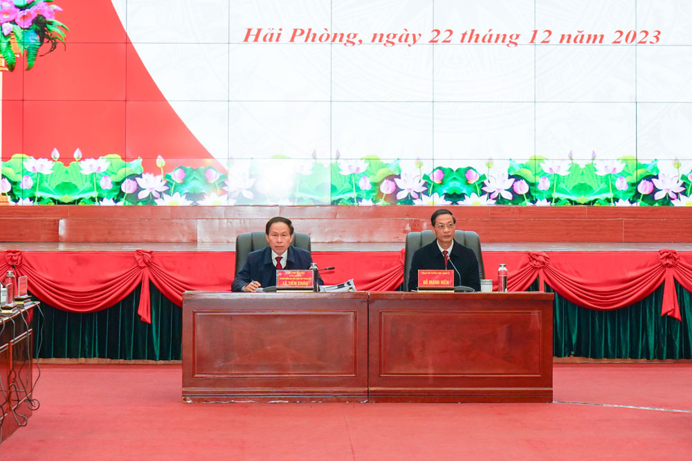 Đồng chí Lê Tiến Châu, Ủy viên Trung ương Đảng, Bí thư Thành ủy, Trưởng Đoàn ĐBQH Hải Phòng và đồng chí Đỗ Mạnh Hiến, Phó Bí thư Thường trực Thành ủy chủ trì Hội nghị.