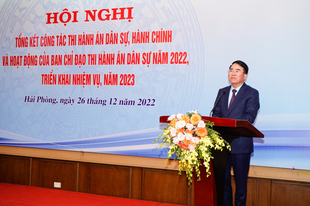 Phát biểu chỉ đạo tại Hội nghị, đồng chí Lê Khắc Nam, Phó Chủ tịch UBND thành phố, Phó Trưởng ban Thường trực Ban Chỉ đạo Thi hành án dân sự thành phố bày tỏ vui mừng trước thành tích của các cơ quan Thi hành án dân sự thành phố những năm gần đây được Bộ Tư pháp, Tổng cục Thi hành án dân sự đánh giá cao. Đặc biệt trong năm công tác 2022 đã đạt và vượt 2 chỉ tiêu cơ bản của Bộ Tư pháp, Tổng cục Thi hành án dân sự giao (chỉ tiêu về việc đạt 82,61%, vượt chỉ tiêu 0,11%; chỉ tiêu về tiền đạt 40,64% vượt chỉ tiêu 0,54%), xếp hạng xuất sắc. Đồng chí nhấn mạnh: Kết quả thi hành án đã góp phần tích cực bảo đảm tính nghiêm minh của pháp luật; bảo đảm an ninh trật tự, an toàn xã hội; bảo đảm quyền và lợi ích hợp pháp của các tổ chức và cá nhân, đồng thời góp phần cải thiện môi trường đầu tư, kinh doanh trên địa bàn thành phố Hải Phòng. Đồng chí đề nghị các cơ quan Thi hành án dân sự thành phố tập trung thực hiện một số nội dung sau: