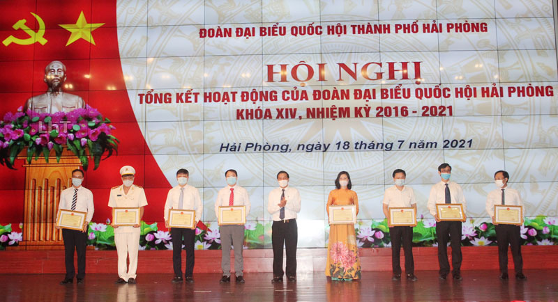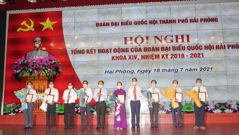 Nhân dịp này, Ủy ban Thường vụ Quốc hội có Nghị quyết trao tặng Kỷ niệm chương hoạt động Quốc hội Việt Nam đối với 9 đại biểu Quốc hội thành phố Hải Phòng khóa XIV. Chủ tịch UBND thành phố tặng Bằng khen cho 8 tập thể, 14 cá nhân đã có thành tích xuất sắc trong hoạt động của Đoàn đại biểu Quốc hội thành phố khóa XIV, nhiệm kỳ 2016-2021.