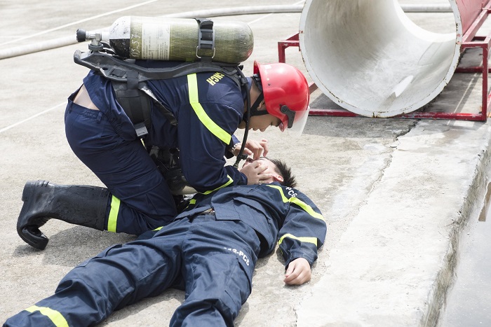 Ngoài ra, đến với chương trình, các học viên được trang bị mũ bảo hộ, găng tay và lần lượt vượt qua các thử thách như: vượt vùng không gian tối có nhiều khói; thực hành một số kỹ thuật sơ cứu và di chuyển nạn nhân khi có tai nạn thương tích; vượt chướng ngại vật, sử dụng bình cứu hỏa để dập tắt bình gas đang cháy…