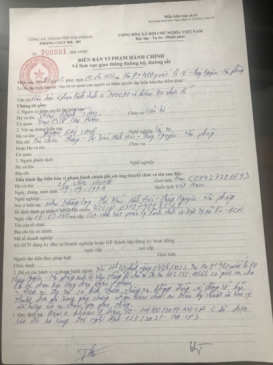 Lúc 11h45 ngày 5/8, trên quốc lộ 10 (QL10), đoạn thuộc huyện Thủy Nguyên, Tổ công tác Trạm CSGT Lưu Kiếm thuộc Phòng CSGT đường bộ-đường sắt (PC08) Công an thành phố làm nhiệm vụ tuần tra kiểm soát TTATGT đã trực tiếp phát hiện, lập biên bản vi phạm hành chính đối với ông Phạm Bảo Long, sinh 1972, trú tại xóm Chiến Thắng, thị trấn Minh Đức, huyện Thủy Nguyên, điều khiển xe ô tô tải mang BKS 15C-105.99 đã vi phạm điểm c khoản 4 Điều 16 Nghị định 100/2019/NĐ-CP: “Điều khiển xe ô tô tải có kích thước thùng xe không đúng với thông số kỹ thuật được ghi trong Giấy chứng nhận đăng kiểm an toàn kỹ thuật và bảo vệ môi trường”. Cụ thể, ô tô tải đã vượt quá chiều cao của thùng xe là 300mm.