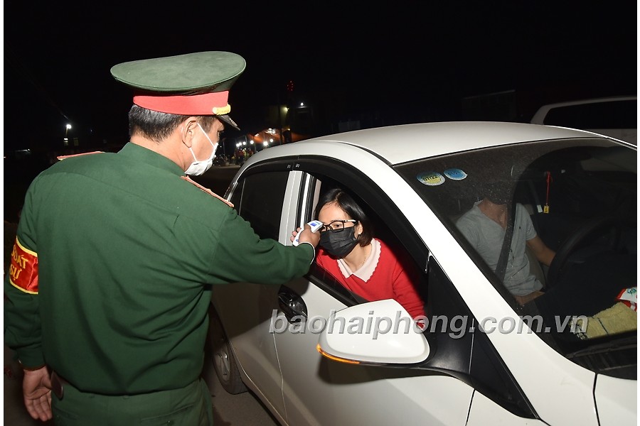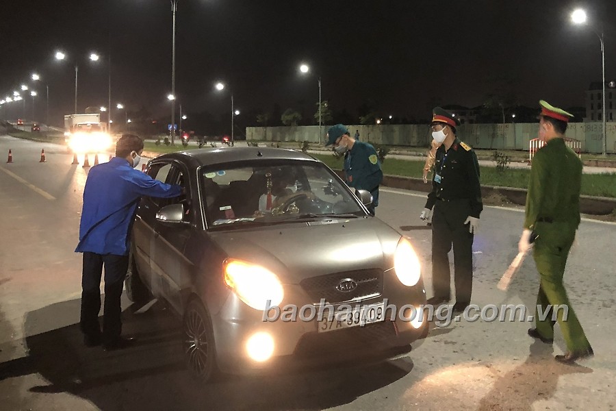 Lực lượng quân đội tham gia kiểm tra người và phương tiện sau 22 giờ tại chốt kiểm soát phòng, chống dịch COVID-19 trên địa bàn xã Hồng Phong, huyện An Dương.