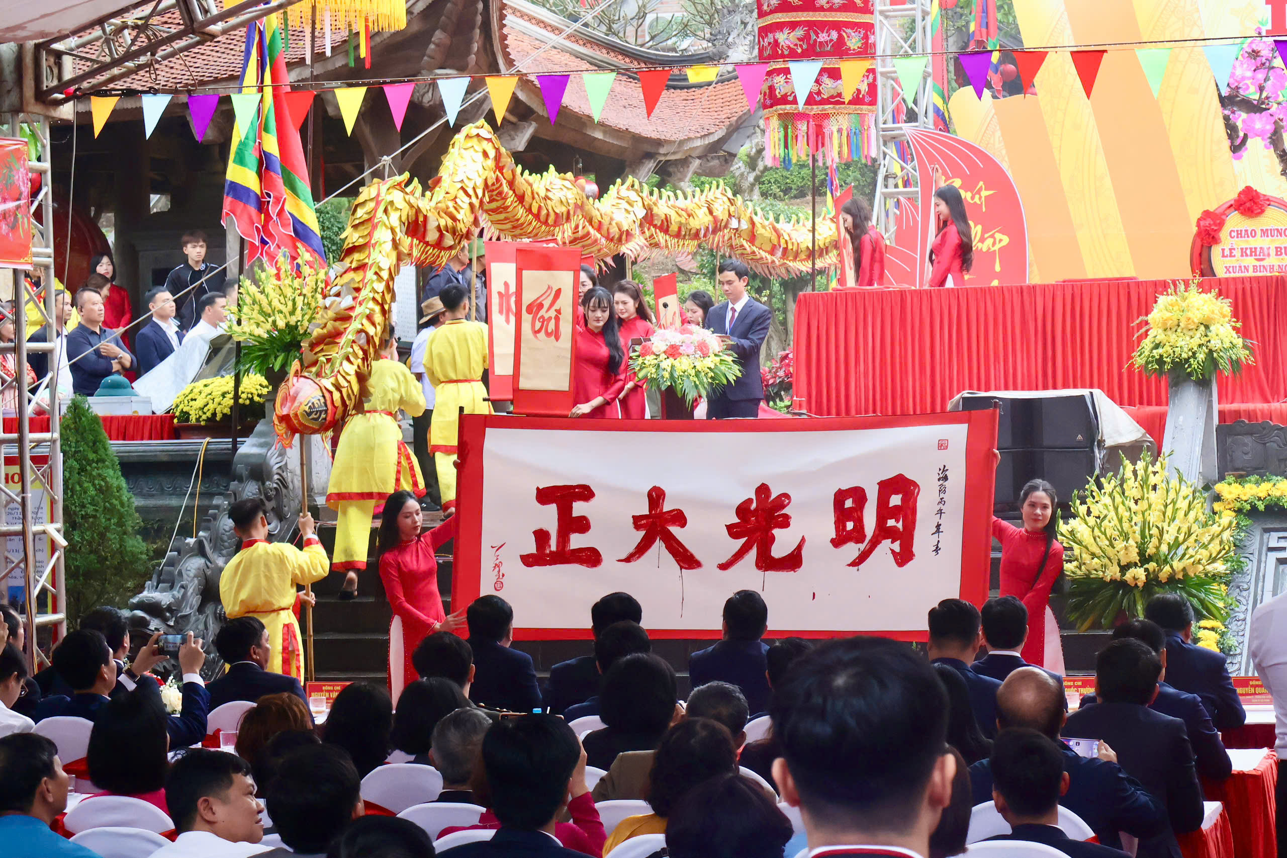 Lễ Khai bút Xuân Bính Ngọ 2026 diễn ra với nhiều nghi thức trang trọng và giàu ý nghĩa như: cung tuyên văn tế, dâng hương tri ân Vạn thế sư biểu; diễn văn khai bút đầu xuân; nghi thức khởi trống khai bút; trình diễn thư pháp Hán văn với bốn chữ “Chính – Đại – Quang – Minh” – biểu trưng cho đường lối đúng đắn, sáng suốt, vì dân vì nước; và nghi thức khai bút chữ Quốc ngữ với các chữ: Khang – Minh – An – Trí – Vinh – Thịnh – Phúc.