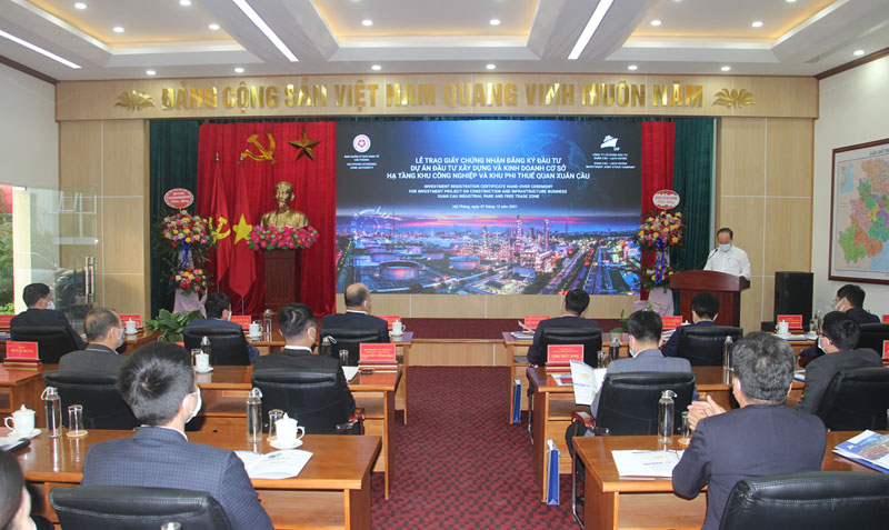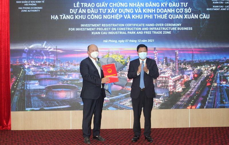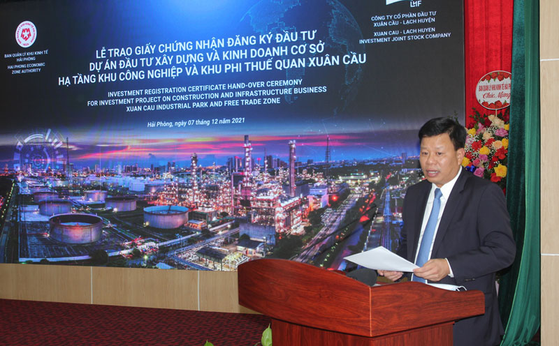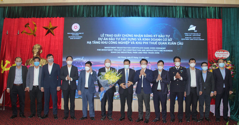 Chiều 7/12, Ban Quản lý Khu kinh tế Hải Phòng tổ chức buổi Lễ trao Giấy chứng nhận đăng ký đầu tư Dự án đầu tư xây dựng và kinh doanh cơ sở hạ tầng khu công nghiệp và Khu Phi thuế quan Xuân Cầu do Công ty CP Đầu tư Xuân Cầu – Lạch Huyện làm chủ đầu tư. Đồng chí Lê Trung Kiên, Ủy viên Ban Thường vụ Thành ủy, Trưởng Ban Quản lý Khu Kinh tế Hải Phòng chủ trì buổi Lễ.