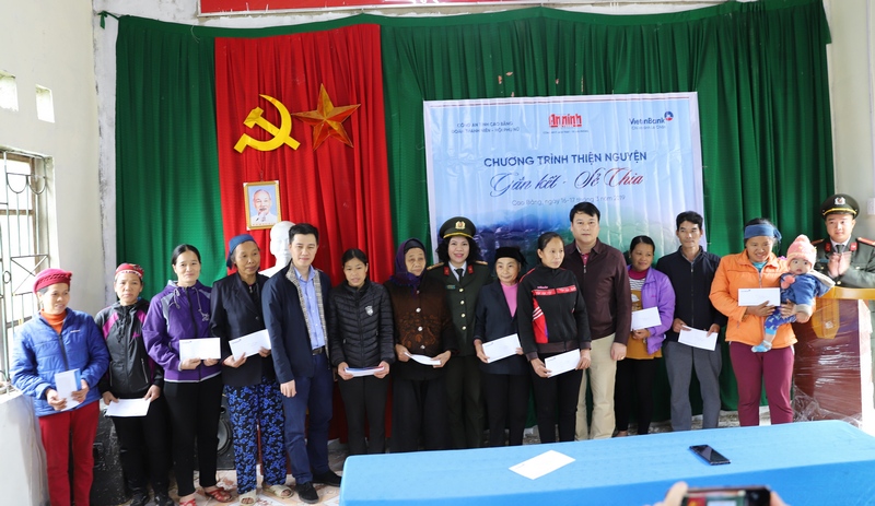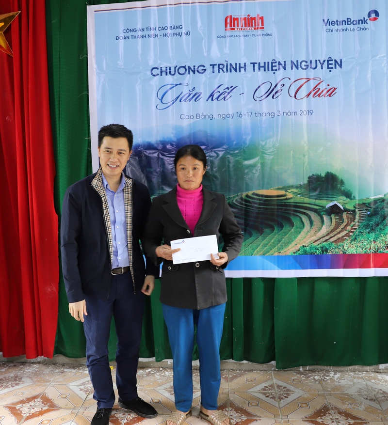 Thượng tá Nguyễn Thu Hồng, Tổng biên tập Báo ANHP, ông Trần Hoài Nam, giám đốc ngân hàng Vietin Bank chi nhánh Lê Chân và ông Nguyễn QUốc Trung, phó chủ tịch UBND TP Cao Bằng trao quà cho các hộ dân xóm Pác Mác