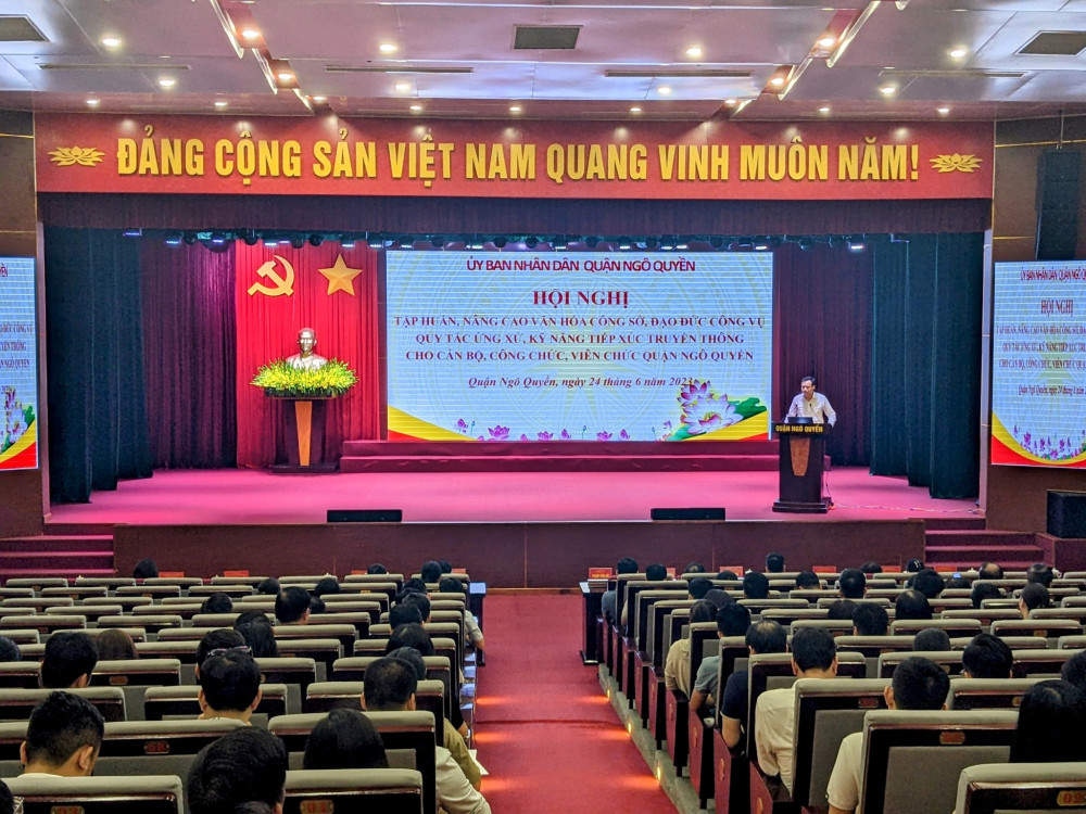 Sáng 24/6, tại Trung tâm Chính trị-Hành chính quận Ngô Quyền, trên 230 cán bộ, công chức, viên chức, người lao động các cơ quan Chính quyền, cơ quan Đảng, đoàn thể quận Ngô Quyền tham gia chương trình Tập huấn nâng cao văn hóa công sở, đạo đức công vụ, quy tắc ứng xử và kỹ năng truyền thông.