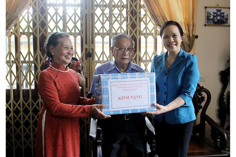 Đồng chí Nguyễn Thị Nghĩa, Phó bí thư Thường trực Thành ủy, Trưởng Đoàn đại biểu Quốc hội Hải Phòng thăm và tặng quà gia đình cụ Nguyễn Như Tiến, cán bộ tiền khởi nghĩa. Ảnh: Đỗ Hiền