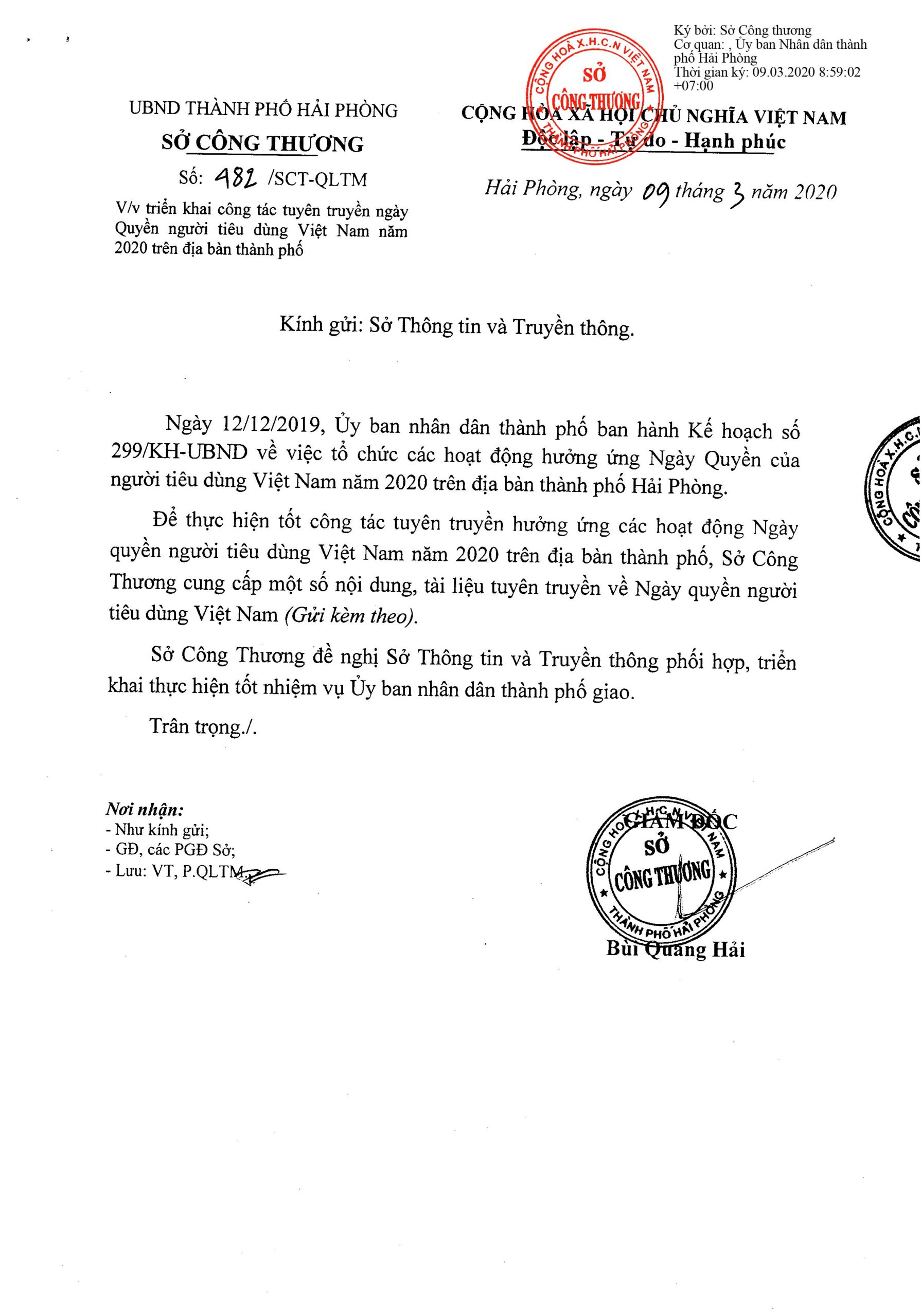 Thực hiện Kế hoạch số 299/KH-UBND ngày 12/12/2019 của Uỷ ban nhân dân thành phố về việc tổ chức các hoạt động hưởng ứng Ngày Quyền của người tiêu dùng Việt Nam năm 2020, Sở Công thương vừa ban hành Văn bản số 482/SCT-QLTM về việc triển khai công tác tuyên truyền ngày Quyền người tiêu dùng Việt Nam năm 2020 trên địa bàn thành phố Hải Phòng.