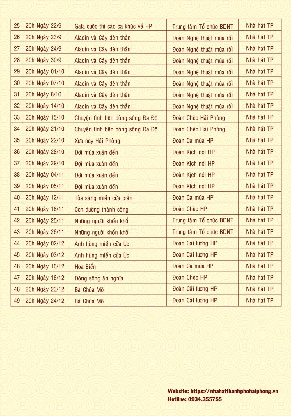Theo Kế hoạch tại Nhà hát thành phố vào các tối Thứ Bảy và Chủ nhật hàng tuần sẽ diễn ra các chương trình nghệ thuật, các vở diễn hàn lâm, kinh điển, đặc sắc của thế giới và của Việt Nam thuộc nhiều loại hình nghệ thuật do các đơn vị nghệ thuật của thành phố, các Nhà hát Trung ương và tỉnh, thành phố bạn, các Công ty tổ chức sự kiện trong và ngoài thành phố thực hiện với sự đồng hành, hỗ trợ của Sở Văn hóa và Thể thao cùng các sở, ngành, đơn vị của thành phố.