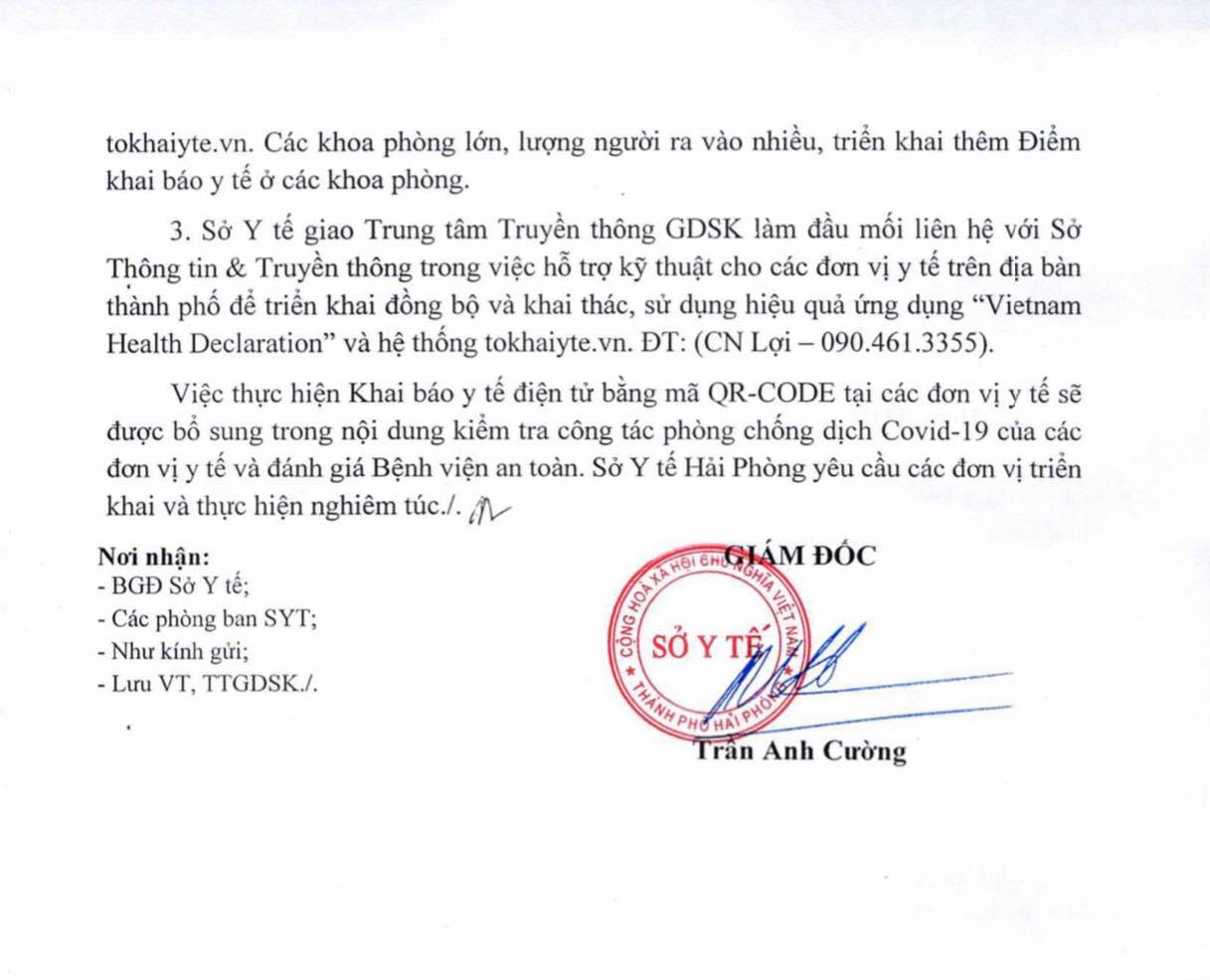 3. Sở Y tế giao Trung tâm Truyền thông GDSK làm đầu mối liên hệ với Sở Thông tin và Truyền thông trong việc hỗ trợ kỹ thuật cho các đơn vị y tế trên địa bàn thành phố để triển khai đồng bộ và khai thác, sử dụng hiệu quả ứng dụng “Vietnam Health Declaration” và hệ thống tokhaiyte.vn.