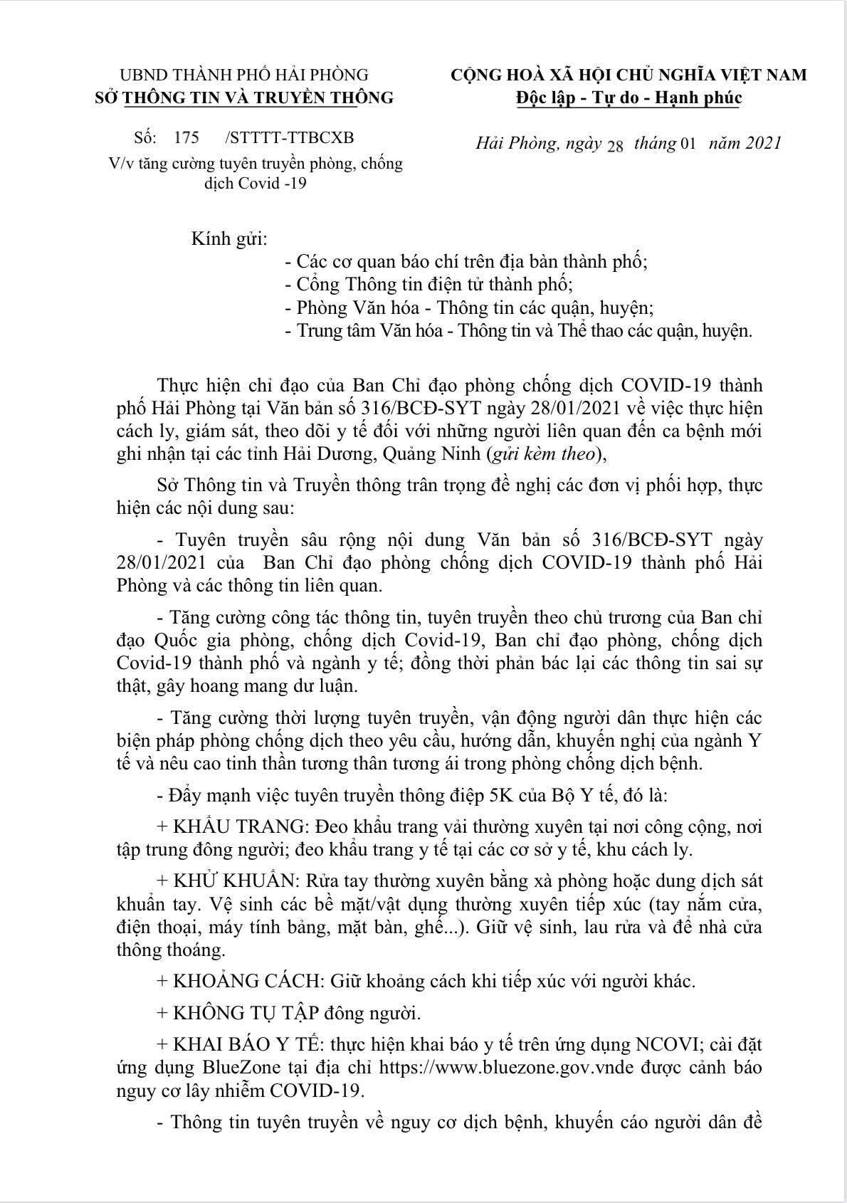 Sở Thông tin và Truyền thông vừa có văn bản số 175/STTTT-TTBCXB ngày 28/01/2021 về việc triển khai theo nội dung chỉ đạo của Ban Chỉ đạo phòng, chống dịch Covid-19 thành phố Hải Phòng trong việc thực hiện cách ly, giám sát, theo dõi y tế đối với những người liên quan đến ca bệnh mới ghi nhận tại các tỉnh Hải Dương, Quảng Ninh.