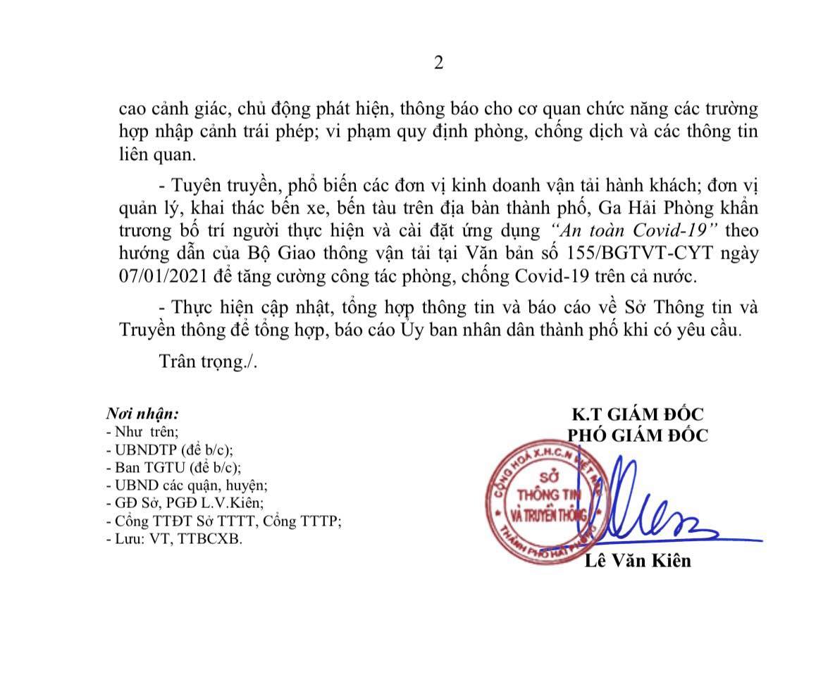 Đồng thời, tuyên truyền phổ biến các đơn vị kinh doanh vận tải hành khách; đơn vị quản lý, khai thác bến xe, bến tàu trên địa bàn thành phố, Ga Hải Phòng khẩn trương bố trí người thực hiện và cài đặt ứng dụng “An toàn Covid-19” theo hướng dẫn của Bộ Giao thông vận tải tại Văn bản số 155/BGTVT-CYT ngày 07/01/2021 để tăng cường công tác phòng, chống Covid-19 trên cả nước.