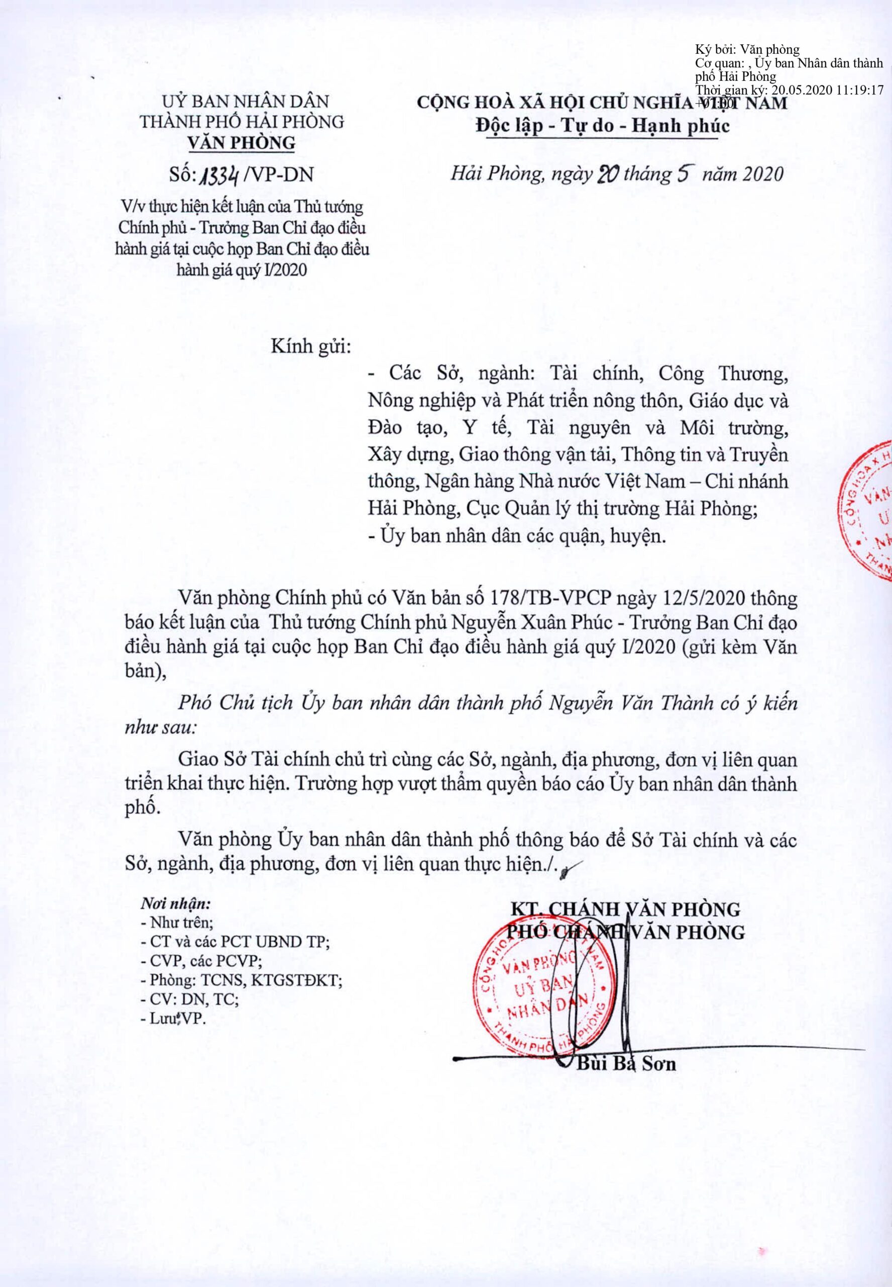 Uỷ ban nhân dân thành phố Hải Phòng vừa có Công văn số 1334/VP-DN ngày 20/5/2020 về việc thực hiện kết luận của Thủ tướng Chính phủ – Trưởng Ban Chỉ đạo điều hành giá tại cuộc họp Ban Chỉ đạo điều hành giá quý I/2020.