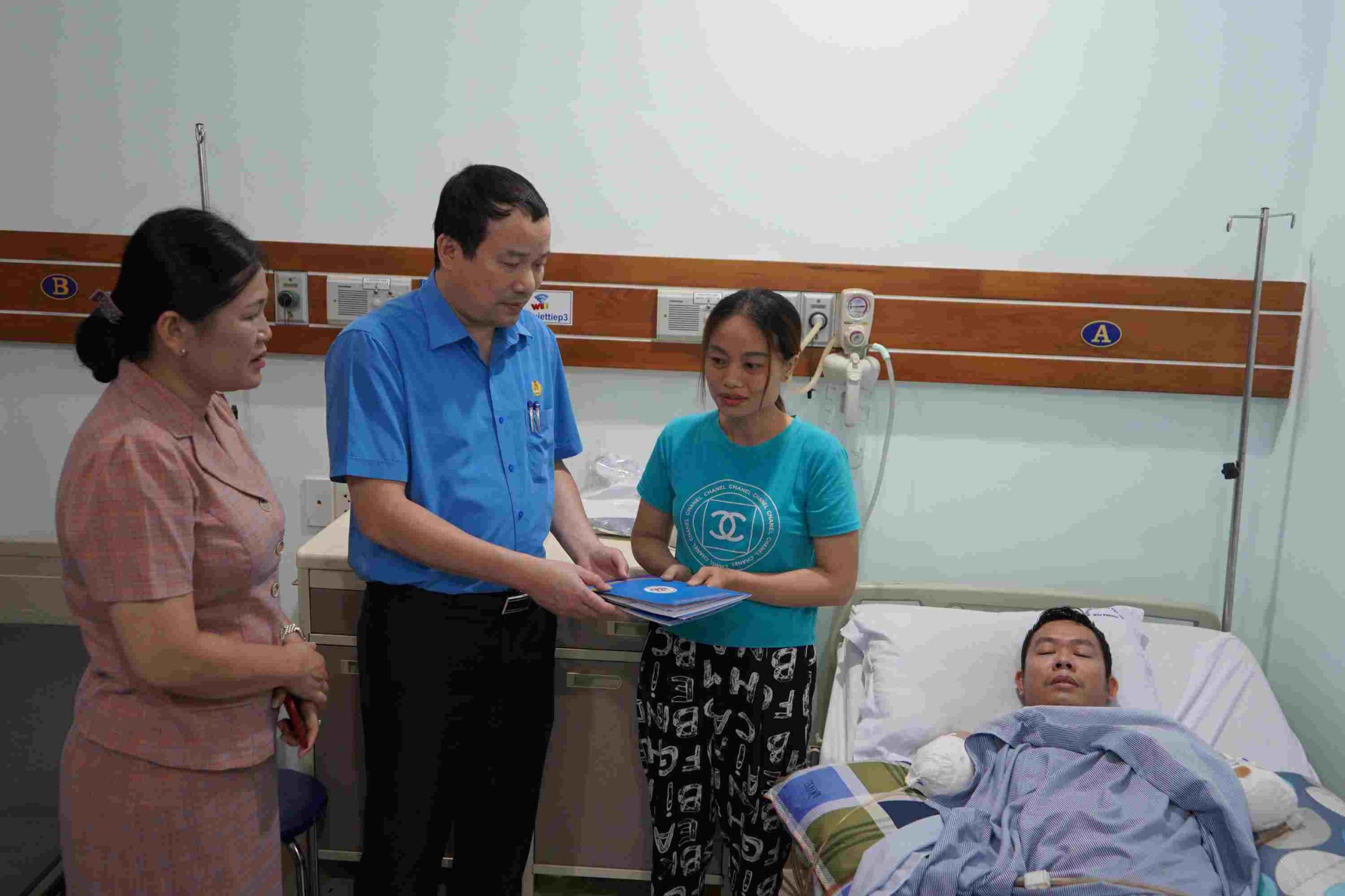 Tại Bệnh viện Hữu nghị Việt Tiệp, nơi anh Đệ đang điều trị chấn thương do tai nạn lao động, đại diện lãnh đạo Liên đoàn Lao động TP.Hải Phòng thăm hỏi, động viên, trao trợ cấp 11 triệu đồng trích từ nguồn Quỹ Mái ấm Công đoàn và nguồn ngân sách Liên đoàn Lao động thành phố.