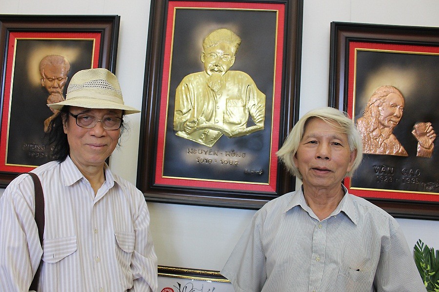 Tác giả (phải) và nhà văn Bão Vũ bên bức chân dung gò đồng nhà văn Nguyên Hồng- tác phẩm được đánh giá cao tại triển lãm.