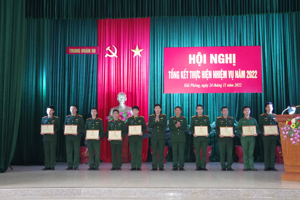 Tại Hội nghị, đại diện lãnh đạo, chỉ huy Bộ CHQS thành phố và Trung đoàn 50 đã trao khen thưởng cho 3 tập thể và 17 cá nhân tiêu biểu, đã hoàn thành xuất săc nhiệm vụ trong thực hiện phong trào thi đua Quyết thắng năm 2022.