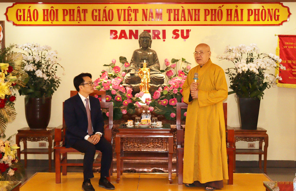 Đồng chí Lê Trí Vũ, Trưởng Ban Dân vận Thành ủy thông tin một số kết quả nổi bật trong phát triển kinh tế-xã hội của thành phố năm 2022. Đồng thời nhấn mạnh trong kết quả, thành tích chung đạt được, có sự đóng góp chung sức của Giáo hội Phật giáo Việt Nam nói chung, Ban Trị sự Giáo hội Phật giáo thành phố Hải Phòng nói riêng và cá nhân Hòa thượng Thích Quảng Tùng. Đồng chí cảm ơn các chư tăng, bà con phật tử bằng tấm lòng từ bi có nhiều đóng góp quan trọng vào sự phát triển kinh tế-xã hội của thành phố, nhất là trong công tác tôn giáo, giữ vững ổn định trật tự và bảo đảm an sinh xã hội.