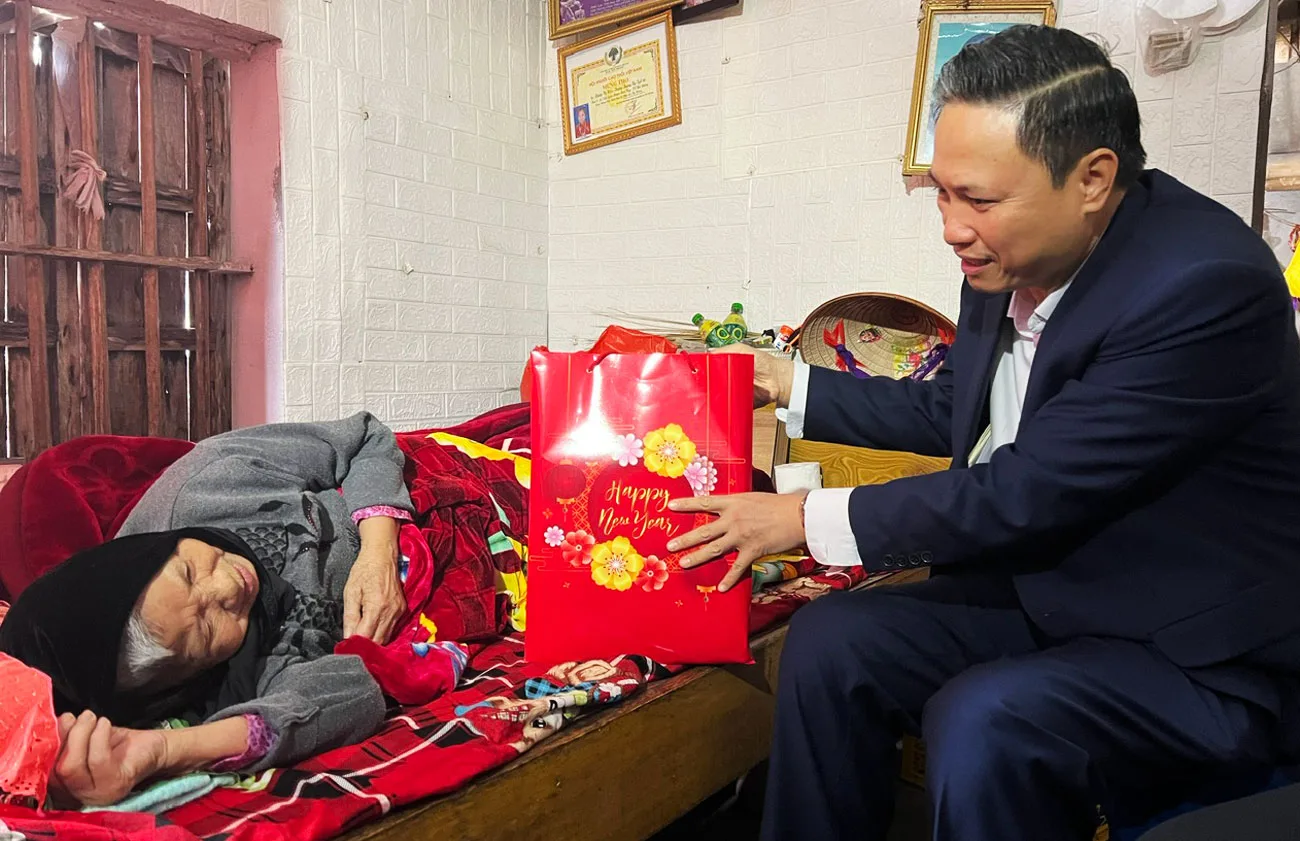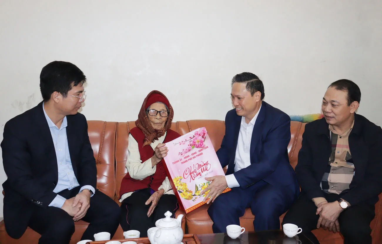 Thăm, tặng quà, chúc Tết bà Hoàng Thị Hiếu, sinh năm 1932, là hộ nghèo, tại thôn 9, xã Kiến Quốc, huyện Kiến Thụy. Đồng chí Trưởng Ban Nội chính Thành ủy động viên gia đình tiếp tục nỗ lực vươn lên trong cuộc sống, đón Tết cổ truyền vui vẻ, hạnh phúc.