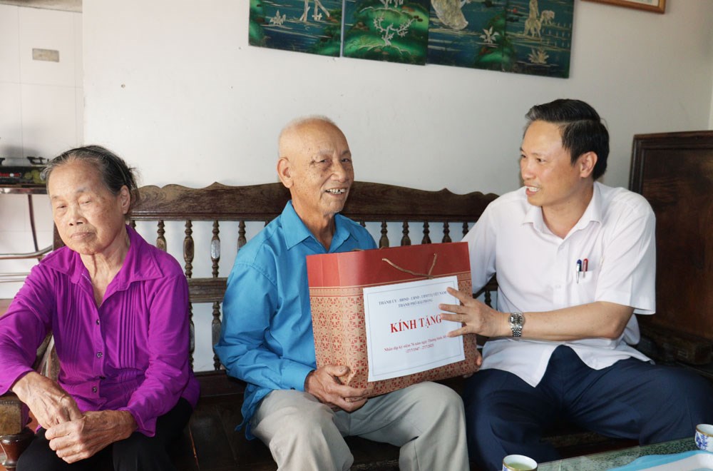 Đồng chí Trưởng Ban Nội chính Thành ủy đến thăm, tặng quà ông Phạm Văn Quản, sinh năm 1945, thương binh hạng 2/4, tỷ lệ tổn thương cơ thể 77%, tại Tổ dân phố Thọ Xuân, thị trấn Núi Đối và thăm, tặng quà ông Đào Xuân Tuấn, sinh năm 1945, người tham gia kháng chiến bị địch bắt tù đày, là người hoạt động kháng chiến bị nhiễm chất độc hóa học, tại thôn 8, xã Kiến Quốc.