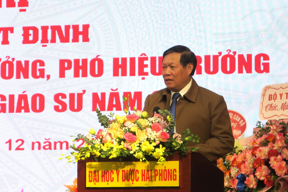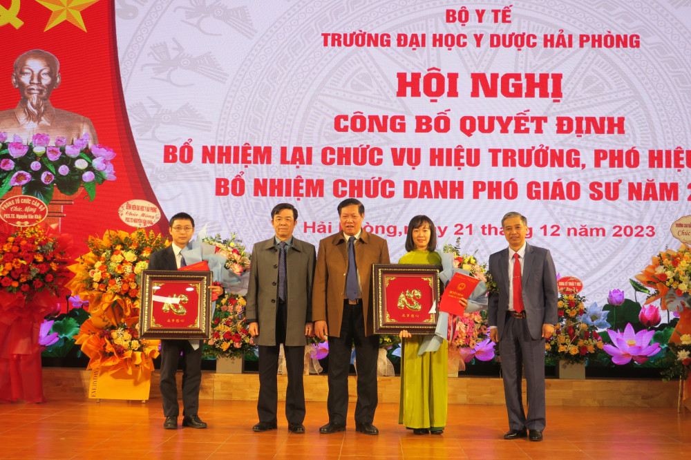 Chiều 21/12, Trường Đại học Y Dược Hải Phòng tổ chức Hội nghị công bố Quyết định bổ nhiệm lại chức vụ Hiệu trưởng, Phó Hiệu trưởng và bổ nhiệm chức danh Phó Giáo sư năm 2023. Đồng chí Đỗ Xuân Tuyên, Phó Bí thư Ban Cán sự Đảng, Thứ trưởng Thường trực Bộ Y tế dự Hội nghị.