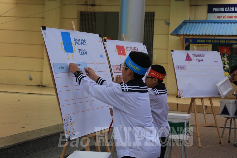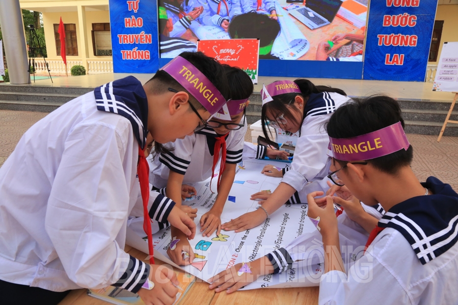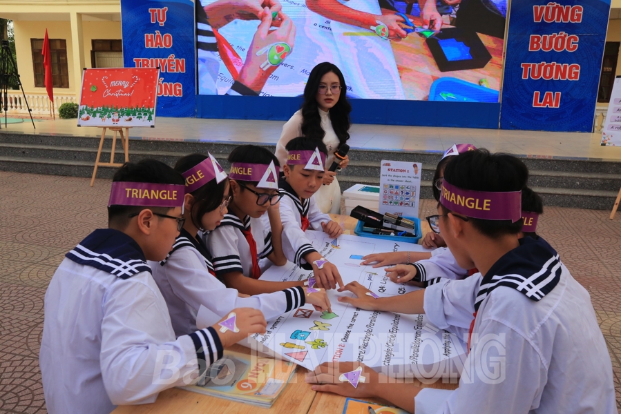 Thực hiện chuyên đề, giáo viên Nguyễn Đình Thảo Trang (Trường THCS Chu Văn An) minh họa dạy và học môn Toán bằng tiếng Anh theo Chương trình giáo dục phổ thông 2018 đối với lớp 6 thông qua tiết luyện tập chung hoạt động trải nghiệm về hình có trục đối xứng và hình có tâm đối xứng. Tại tiết học, các học sinh được chia thành 4 nhóm và tham gia các nội dung gồm: Hoạt động khởi động tiết học, tham quan “Vùng đất đối xứng”; khám phá 4 Trạm trải nghiệm; tham gia thi “Nhà thiết kế tí hon” và thu hoạch kiến thức về thế giới quanh ta. Theo đó, giáo viên là người hướng dẫn về từ vựng, từ mới có liên quan đến chủ đề để học sinh dịch đề toán, biết cách đọc và làm quen với một số dạng bài tập có đề bài bằng tiếng Anh.