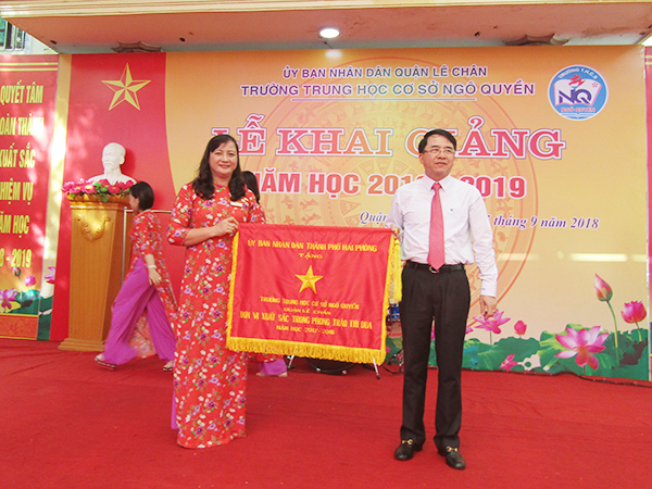 Đồng chí Lê Khắc Nam, Ủy viên Thường vụ Thành ủy, Phó Chủ tịch UBND thành phố trao Cờ thi đua xuất sắc của UBND thành phố tặng Trường THCS Ngô Quyền (quận Lê Chân)